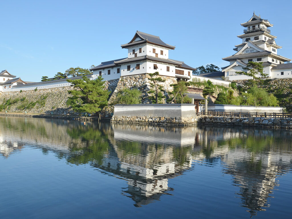 関ヶ原の戦いでの戦功により藤堂高虎が、瀬戸内海に面した海岸に築いた大規模な平城です。別名吹揚城(ふきあげじょう)ともいいます。明治維新後に建造物のほとんどが取り壊され、内堀と主郭部の石垣を残すのみとなりました。昭和28年(1953)に県指定史跡となり、昭和55年(1980)以降、主郭部跡に天守をはじめとする櫓、門などの再建が進み、雄大な城郭の姿を見せています。